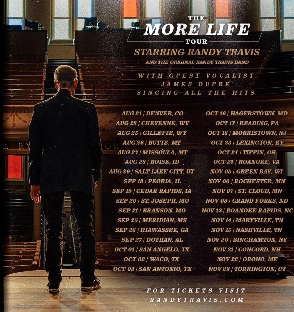 The vinyl release comes in advance of the next leg of the “More Life Tour,” a salute to the music of Randy Travis, featuring his original band members, guest vocalist James Dupré and a unique touch, Randy and his wife, Mary, onstage the entire show interacting with Dupré, the band, and the audience – something Randy has missed since his 2013 stroke sidelined him from touring the world. Tickets can be purchased at his website: RandyTravis.com.