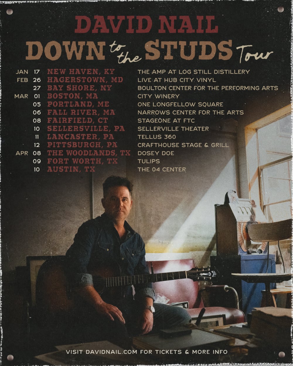 David Nail, a guitar, and a couple hundred fans. No band, no road crew, no frills. Just a man, journeying across the country in his own car with a guitar and some songs. The shows on his 2026 “Down to the Studs Tour” will be more intimate than any he’s ever played, he’ll meet honest music lovers, share stories with them, laugh, cry, truly experience human moments in a world cluttered by manipulation. And he’s never been more excited. Tickets go on-sale on Friday, January 16 at 10 a.m. CST at DavidNail.com.