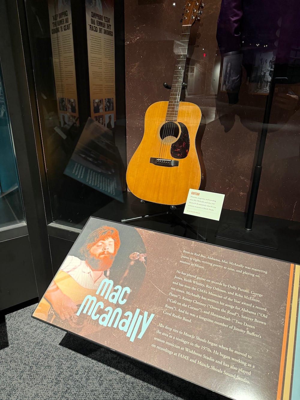 NASHVILLE, Tenn. (December 2, 2025) – One of music’s most well respected singers, songwriters, and musicians, Mac McAnally is featured in the Country Music Hall of Fame and Museum’s newest exhibit, “Muscle Shoals: Low Rhythm Rising,” open now through March 2028. Dedicated to the songs and musicians who came out of Muscle Shoals, Alabama, the exhibit honors the legendary recording studios that became havens for aspiring artists and songwriters. McAnally became a studio musician in Muscle Shoals during his teenage years, hailing from nearby Mississippi. He notably played a 1967 Martin D-18 Acoustic Guitar, which is featured in the exhibit. He also participated in a filmed interview with museum curators, which is played on video screens and interactive elements throughout the exhibit, along with his songs.